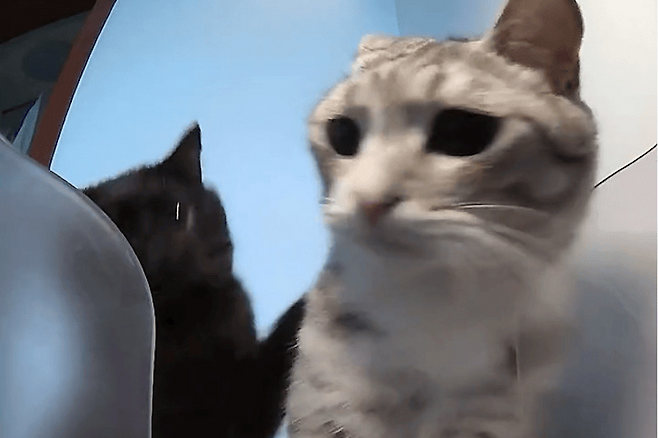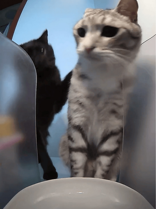 그러던 어느 날 밤, 예상치 못한 사태가 발생했습니다. 자동 급식기가 갑자기 멈춰버린 것입니다! 회색 고양이가 아무리 얼굴 인식을 시도해도 사료는 나오지 않았습니다. 검은 고양이는 초조해지며 회색 고양이를 계속 재촉했습니다. 회색 고양이는 난감한 표정으로 검은 고양이의 안달 난 모습을 바라보며 "나도 어쩔 수 없어!"라고 생각하는 듯했습니다.