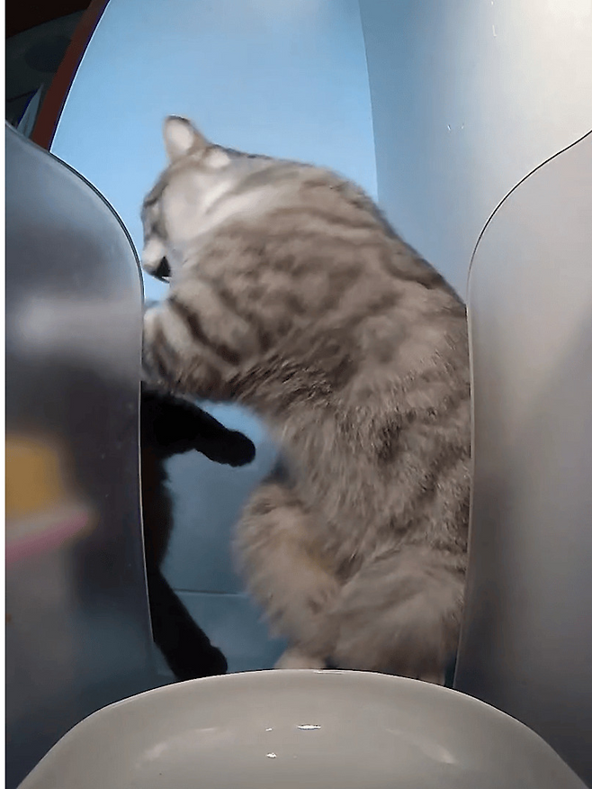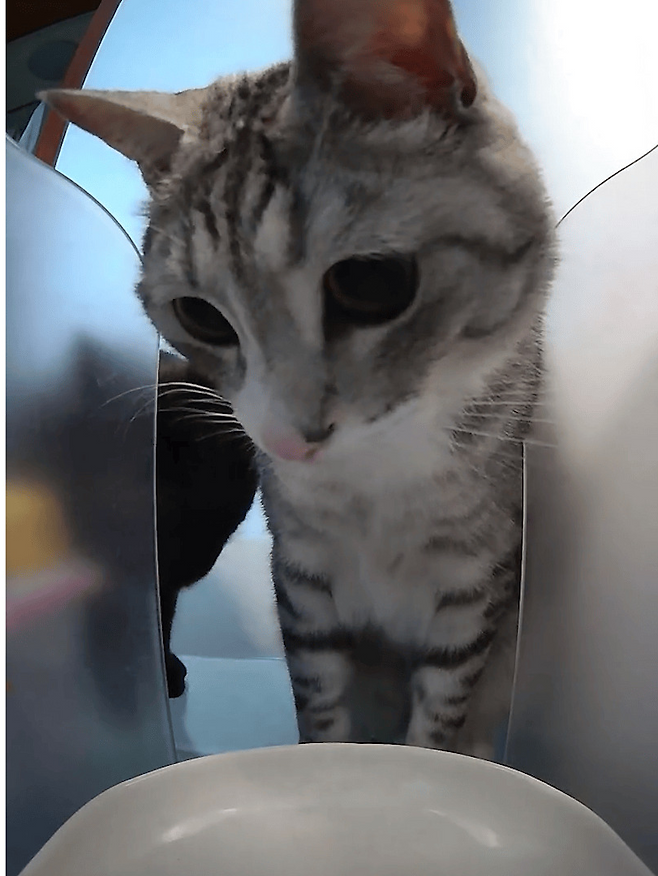 상황을 재빨리 파악한 그녀는 급식기를 고쳤고, 그제야 검은 고양이는 진정되었습니다. 고양이는 마치 폭풍을 몰고 온 듯 사료를 순식간에 흡입했습니다.