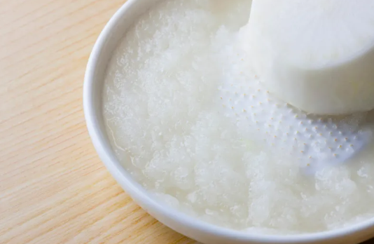 ▶ 무 1/3~1/2개를 강판에 곱게 갈아 즙을 냅니다.