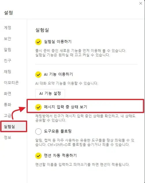 좌측 메뉴에서 실험실을 선택한 후 메시지 입력 중 상태 보기 항목을 찾아 토글 스위치를 끄면 됩니다. 모바일과 PC의 설정이 연동되지 않기 때문에 양쪽 모두에서 개별적으로 해제 작업을 수행해야 합니다.