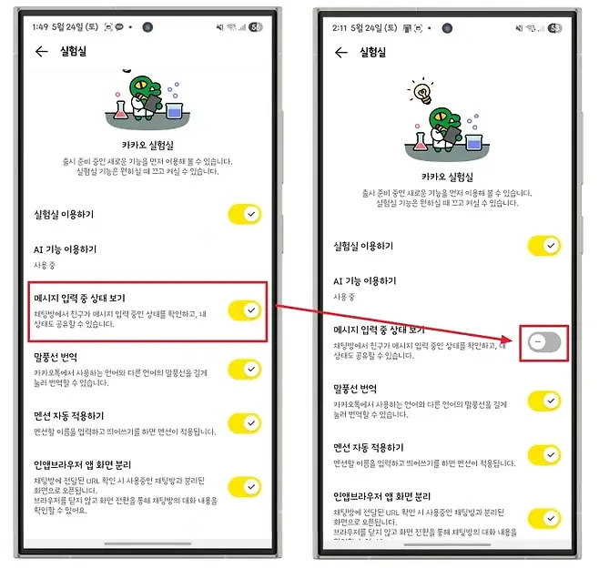 실험실 메뉴에서 메시지 입력 중 상태 보기 항목 옆의 토글 스위치를 비활성화하면 됩니다. 이때 본인의 입력 상태도 상대방에게 표시되지 않으며, 상대방의 상태 역시 확인할 수 없게 됩니다.