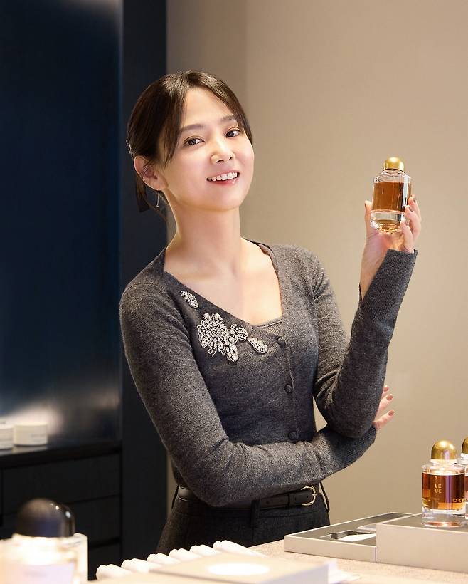 깔끔하게 묶어 올린 로우 번 헤어스타일과 은은한 미소를 지으며 어딘가를 응시하는 옆모습은 마치 한 편의 화보 같은 아우라를 자아내고 있어요.