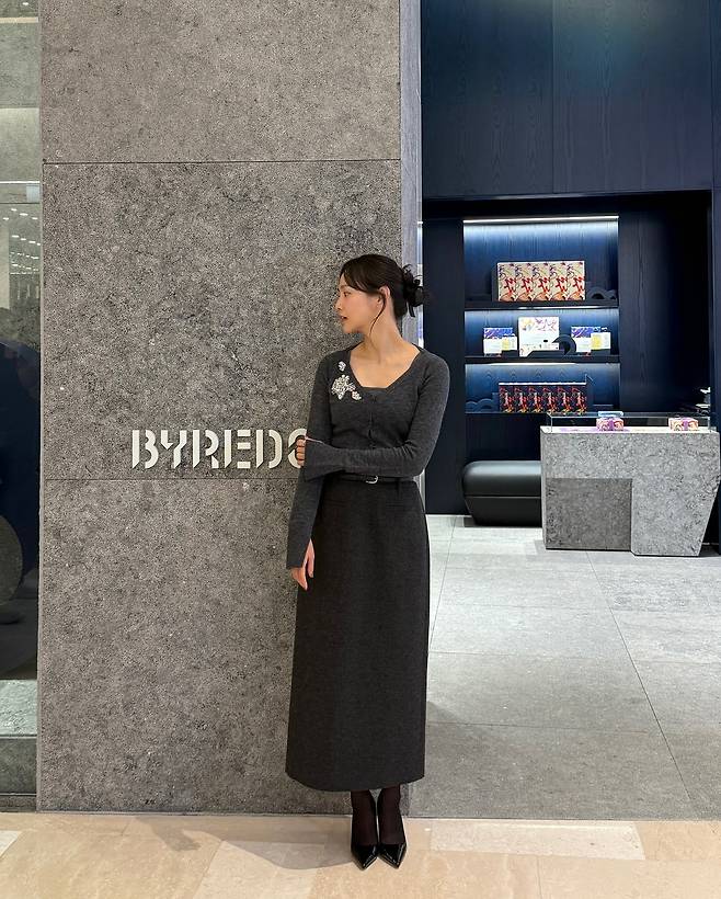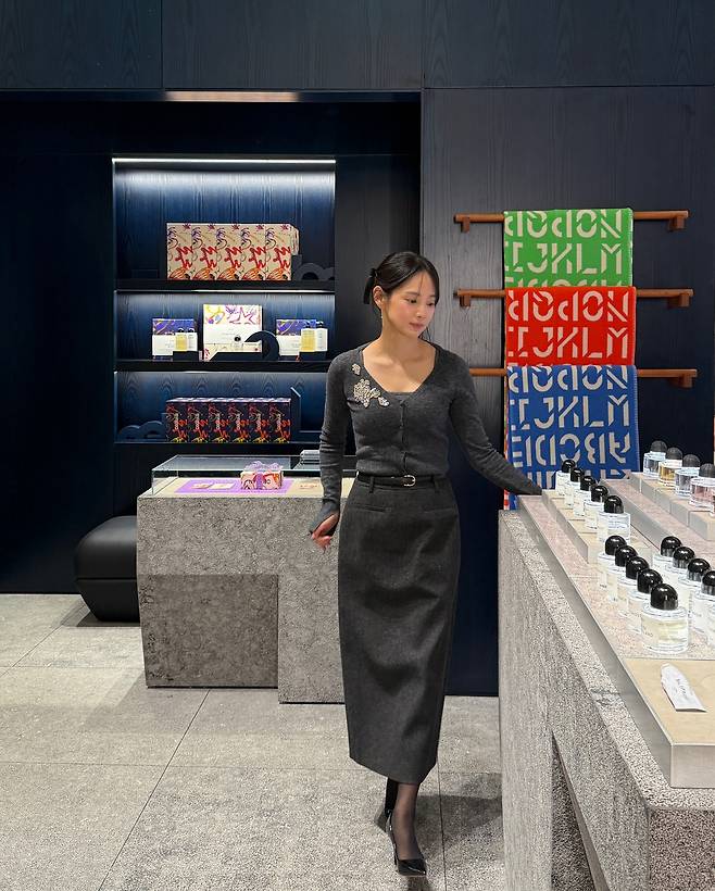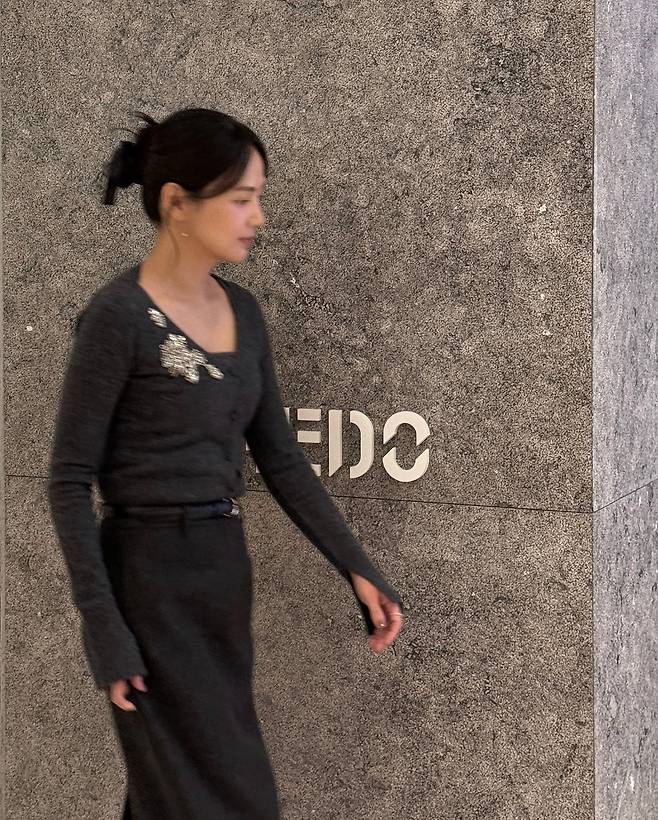 사진 속 윤승아는 짙은 차콜 그레이 컬러의 니트 톱과 롱 스커트를 셋업으로 매치해, 지적이면서도 우아한 분위기를 연출했는데요.