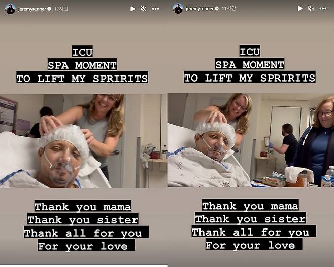 제레미 레너는 5일 자신의 인스타그램에 병원에서 샤워캡을 쓰고 병원 침대에 누워있는 영상을 올렸다.