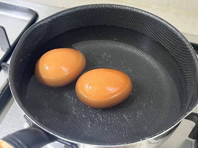 계란을 반숙으로 삶습니다. 물이 끓기 시작한 시점부터 8~9분 삶고 꺼내면 반숙 형태로 완성됩니다.
