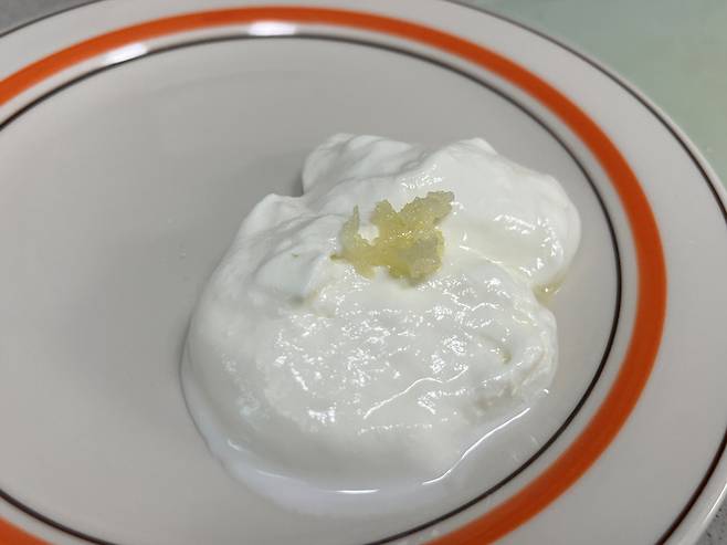 그릭요거트와 그냥 먹어도 되지만, 조금 더 색다르고 맛있게 만드는 방법이 있습니다. 그릭 요거트 3스푼을 그릇에 덜어낸 다음 마늘 1쪽을 다져서 넣고 섞으세요.
