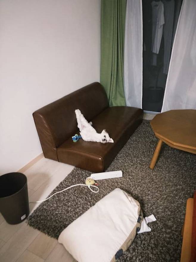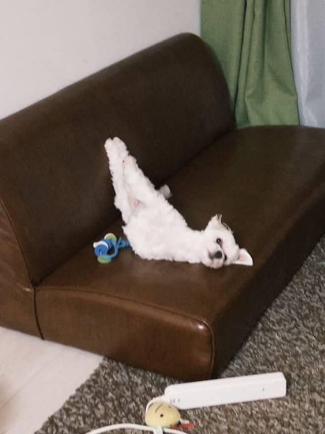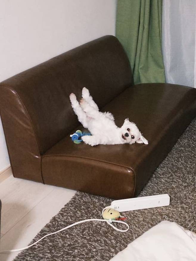 공개된 사진 속에는 무슨 영문인지 소파에서 다리를 하늘 위로 쭉 뻗은 자세로 드러누워 있는 말티즈 강아지 모습이 고스란히 담겨 있었는데요.