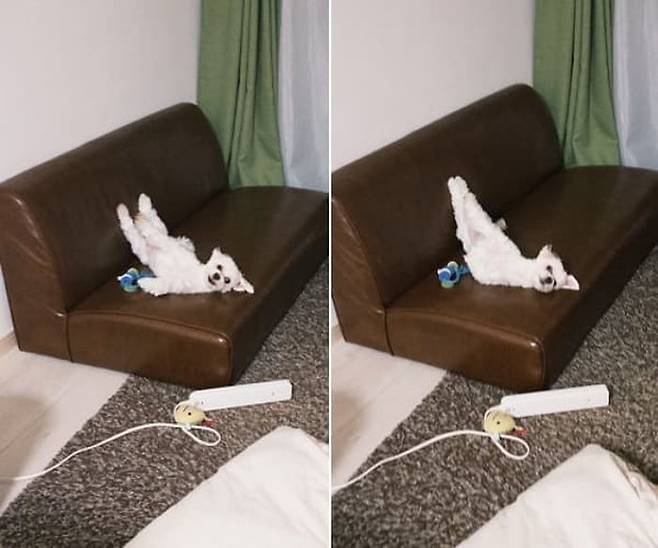 사연은 이렇습니다. SNS상에는 소파에서 다리 위로 쭉 뻗고 누워 있는 말티즈 강아지의 생각지 못한 자세가 담긴 사진이 올라온 것.