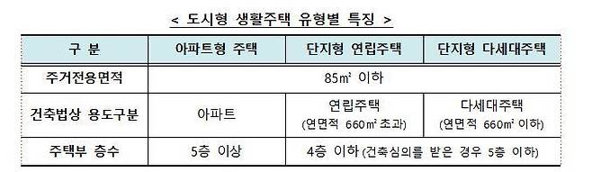 국토부는 '소형주택' 유형을 '아파트형 주택'으로 바꾸고, 3∼4인 가구를 위한 전용면적 85㎡ 이하 가구로 구성된 5층 이상 아파트 형태를 허용하기로 했다.