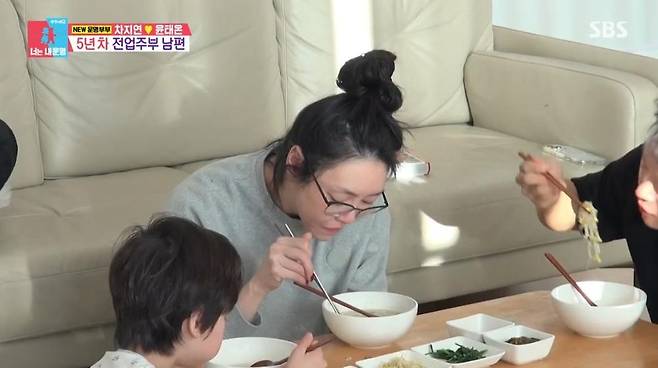 남편은 익숙한듯 혼자 닭곰탕을 준비하며 열심히 아침밥을 만들었다. 반면 옆에 있던 아내 차지연은 자신의 영양제만 수북하게 챙겨 먹어 웃음을 자아냈다. 아들과 함께 거실에 앉아 남편이 씻어준 블루베리를 먹는 차지연의 모습에 김구라는 "한번 먹어보라는 소리도 안 한다"라고 일침해 차지연을 당황하게 했다.
