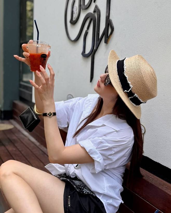 특히 눈에 띄는 건 그녀의 액세서리 선택이다. 베이지 컬러의 스트로햇은 햇살 가득한 카페와 자연스럽게 어우러지며 여름 감성을 더한다. 손목에는 블랙 가죽 스트랩 시계와 볼드한 골드 디테일이 더해진 브레이슬릿을 착용해 미니멀한 룩에 세련된 포인트를 줬다. 테이블 위에 놓인 미니 골드 핸들 백은 아트 오브제처럼 보이며 룩의 완성도를 높여준다.