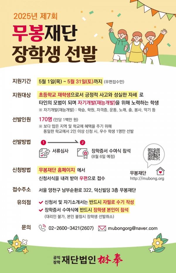 올해는 보다 많은 어린이들에게 자기개발의 기회를 주고자 지난해 보다 10명 이상 늘어난 170명 의 장학생을 선발하여 1인당 100만원씩, 1억 7천만원의 장학금을 전달한다. 서류접수는 우편으로만 진행하며, 무봉재단 홈페이지(http://mubong.org)를 통해 장학생 모집공고 를 확인할 수 있다.