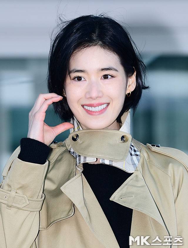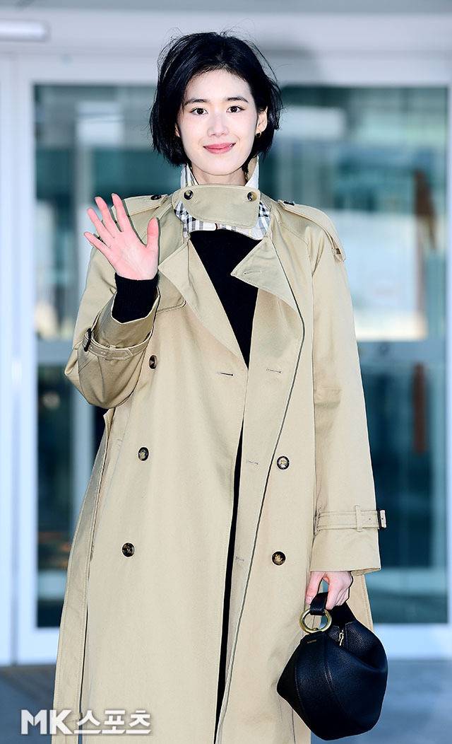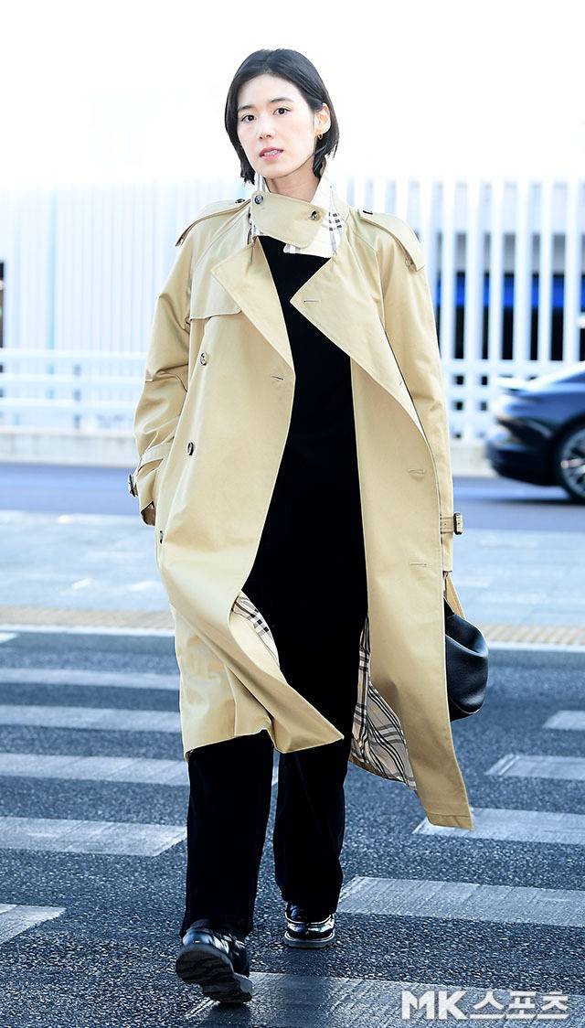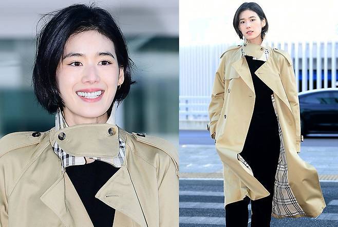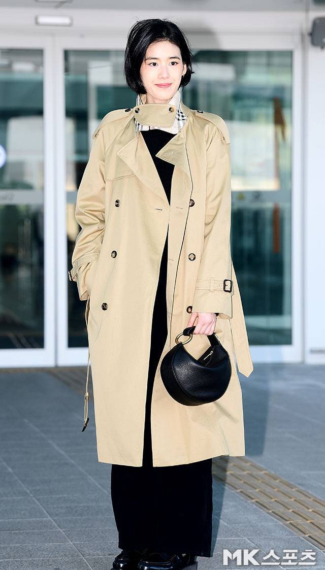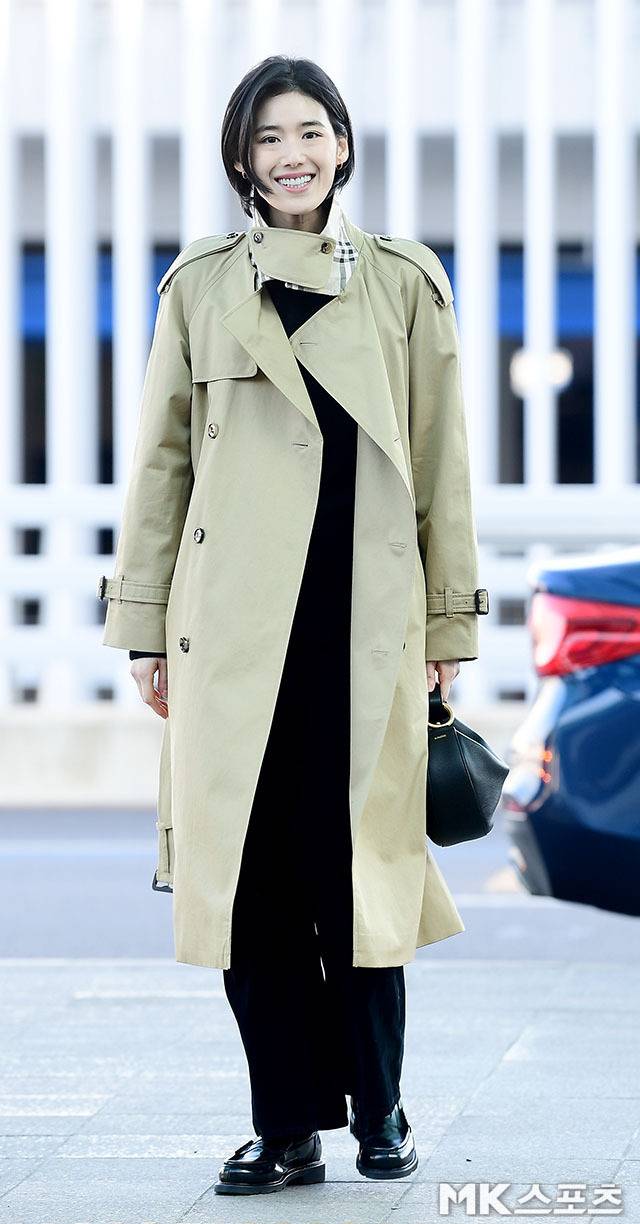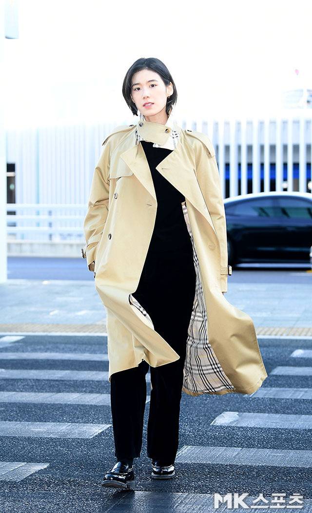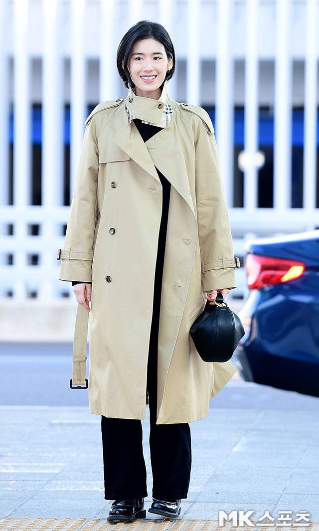 배우 정은채가 트렌치코트를 활용해 고급스러운 공항 패션을 완성했습니다.