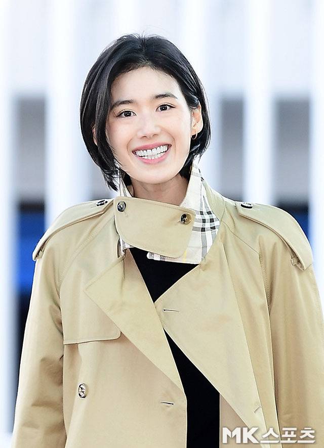 특히 트렌치코트의 칼라 부분에서 살짝 보이는 버버리 특유의 체크 패턴이 감각적인 포인트를 더하며, 정은채 특유의 차분하고 우아한 이미지와 완벽한 조화를 이루었습니다.