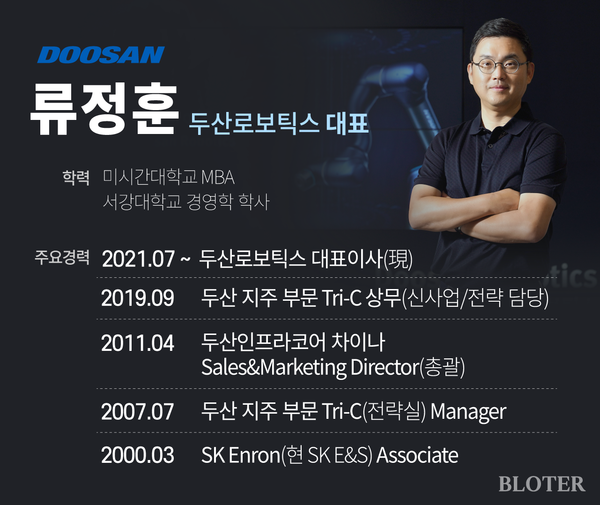 류 대표는 Tri-C 매니저로 4년간 일하며 M&A , 인수후통합(PMI) 등에 관여했으며, 2011년 두산인프라코어(현 HD현대인프라코어) 중국법인의 세일즈&마케팅 총괄로 선임됐다. 2019년 상무로 승진해 지주사 Tri-C로 복귀한 뒤 그룹의 신사업을 챙겼다. 당시 협동로봇 역시 두산이 전략적으로 키웠던 사업이었기 때문에 류 대표의 스터디 대상이었다. 이런 인연으로 류 대표는 지주사 복귀 2년 만인 2021년 두산로보틱스 대표로 낙점됐다. 두산로보틱스는 그룹의 미래 먹거리로 꼽혔지만 협동로봇 상업생산 3차의 신생회사였다. 그룹은 두산로보틱스를 이끌 적임자를 찾기 위해 여러 차례 인사를 단행했다.