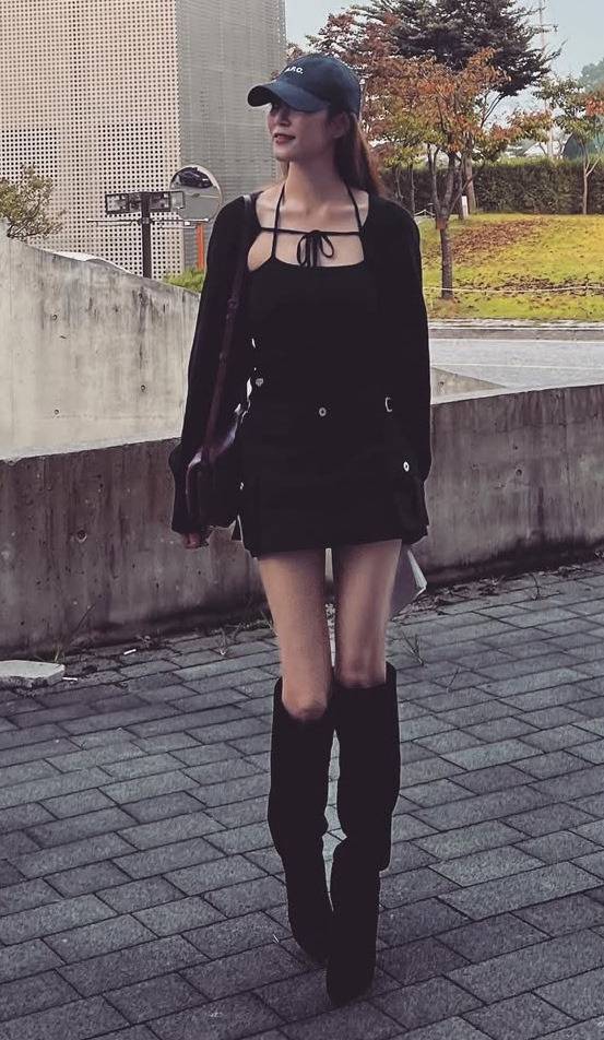 미니 기장의 투피스와 니하이 부츠를 매치해 각선미를 강조하며, 스트리트 감성도 가미했습니다.