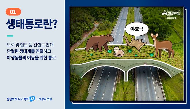 운전을 하다 보면 발생할 수 있는 동물 찻길 사고. 일명 로드킬이라고 하는데요. 특히 점차 날씨가 따뜻해지면서 동물들의 활동도 증가해 봄부터 여름 사이, 이런 로드킬 사고가 많이 발생한다고 합니다. 로드킬 사고를 막기 위해 지자체에서는 생태통로를 만드는 등 다양한 노력을 하고 있는데요. 과연 이런 생태통로는 효과가 있는 걸까요? 그래서 오늘은 생태통로란 무엇이고 얼마만큼의 효과를 거두고 있는지 알아보려고 합니다.