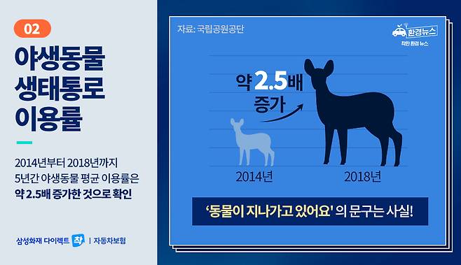 하지만 최근 들어 생태통로가 야생동물에게는 없어서는 안 될 중요한 통로 역할을 톡톡히 하고 있다는 사실이 증명되었습니다. 국립공원공단이 2014년부터 2018년까지 생태통로 이용률을 분석한 결과, 5년간 야생동물 평균 이용률은 약 2.5배 증가한 것으로 확인됐습니다. 운전 중 생태통로를 마주했을 때 보던 ‘동물이 지나가고 있어요'의 문구는 사실이었네요!
