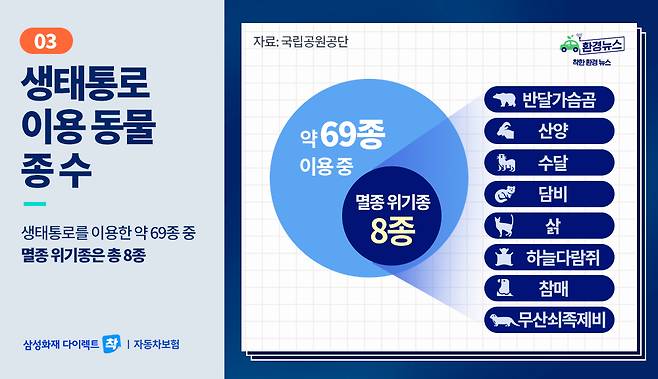 게다가 고라니 등 개체 수가 많은 동물에 비해 빈도수가 많지는 않지만 멸종 위기 동물들도 생태통로를 이용한다고 합니다! 실제로 국립공원공단에 따르면 생태통로를 이용한 69종 중 멸종 위기종은 반달가슴곰, 산양, 수달, 담비, 삵, 하늘다람쥐, 참매, 무산쇠족제비로 총 8종이었다고 하네요.