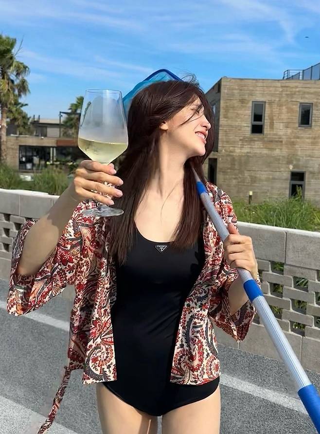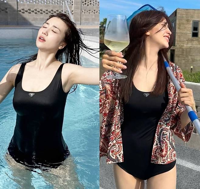 공개한 사진과 영상에서 박하선은 블랙 원피스 수영복에 셔츠 가운을 걸친 스윔웨어로 늘씬한 몸매를 자랑했다.