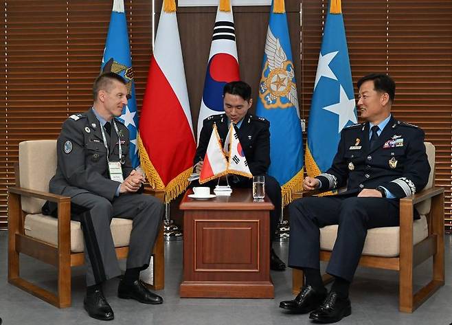 [서울=뉴시스] 정상화 공군참모총장이 18일 경기 성남 서울공항 ADEX 행사장 내 국방 샬레에서 이레네우스 노박(Ireneusz NOWAK) 폴란드 공군사령관(소장)과 대담을 나누고 있다. (사진=공군 제공) 2023.10.18. photo@newsis.com *재판매 및 DB 금지