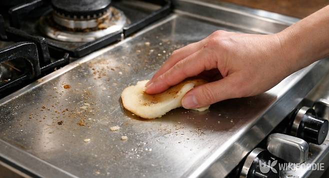 껍질의 안쪽 흰 면이 바닥에 닿도록 잡고, 기름때가 낀 부분을 부드럽게 문지른다. 감자에 들어 있는 녹말 성분이 기름기를 흡착하면서 표면에서 오염이 분리된다. 눌어붙은 자국이 심하다면 뜨거운 물을 살짝 뿌려 기름을 불린 뒤 다시 문지르면 훨씬 쉽게 떨어진다. 마지막으로 젖은 행주와 마른 천으로 한 번씩 닦아주면 미끈거림 없이 마무리된다.