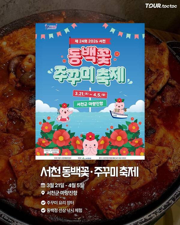 충남 서천 마량진항에서 열리는 3월 말 대표 음식 축제입니다. 붉게 피는 동백꽃과 봄 제철 해산물인 주꾸미를 함께 즐길 수 있는 행사입니다.