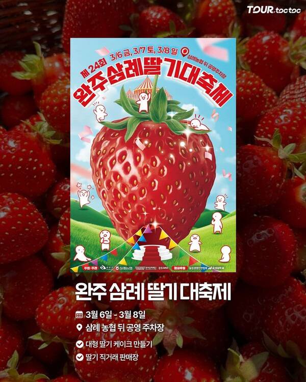 3월은 딸기 당도가 높은 시기로, 봄철 대표 과일을 맛볼 수 있는 시기입니다. 전북 완주 여행을 계획하고 있다면 완주삼례딸기대축제를 통해 제철 먹거리 여행을 즐겨보시기 바랍니다.