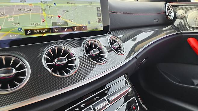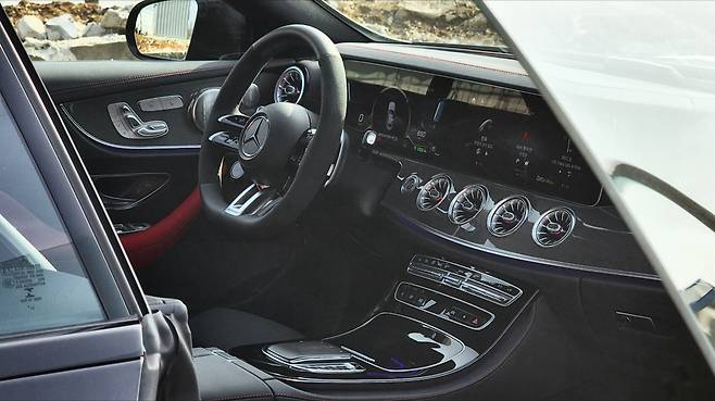 인테리어도 디자인도 E클래스 세단과 유사하다. 12.3인치 병렬 디스플레이 '와이드 콕핏'으로 디지털 인터페이스를 구축했다. 센터페시아에는 최소화된 버튼만 남아있고, 변속기도 칼럼기어 형식으로 매우 심플하다. AMG 전용 D컷 스티어링 휠의 버튼들도 터치식으로 작동되는데 다행히 부자연스러운 감각은 아니다. E53부터 제공되는 드라이브 모드 선택 다이얼이 운전에 대한 흥미를 자극한다. AMG가 튜닝한 리얼 카본 대시보드 패널과 터빈 블레이트를 형상화한 에어벤트, 낮에는 은은하게 빛을 내는 엠비언트 라이트가 화려함을 이끌어낸다. AMG 액티브 멀티 컨투어 시트는 주행 모드에따른 최적의 착좌감을 제공해 주기도 한다.