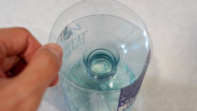 잘라낸 윗부분을 거꾸로 꽂아 깔때기 모양으로 덮습니다.
