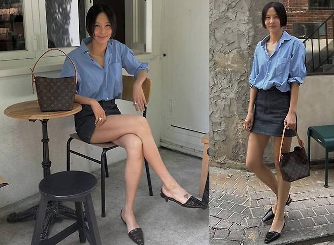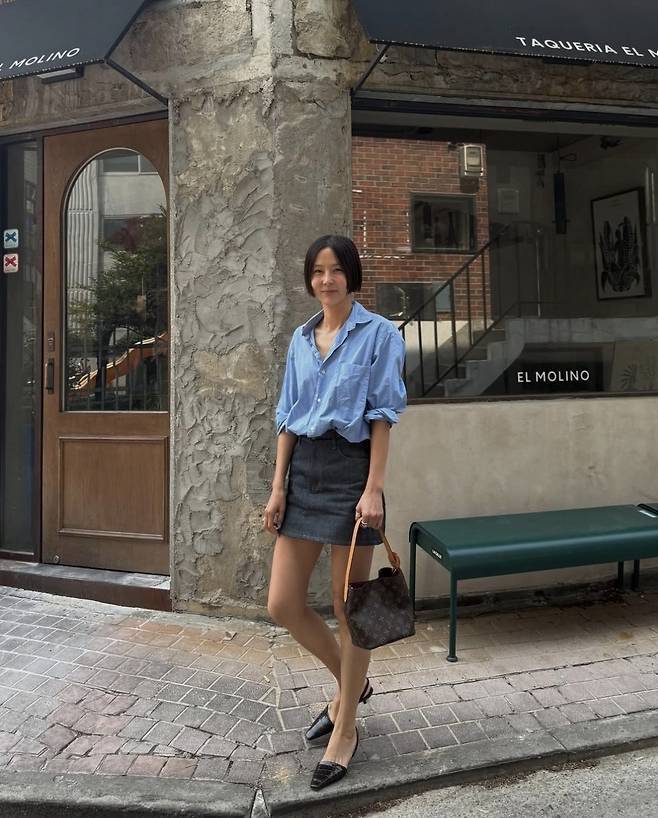 김나영은 루이비통 모노그램 버킷백을 어깨에 걸치고, 여유롭게 풀어낸 블루 셔츠에 다크 데님 미니스커트를 매치해 쿨한 청청패션의 진수를 선보였습니다.