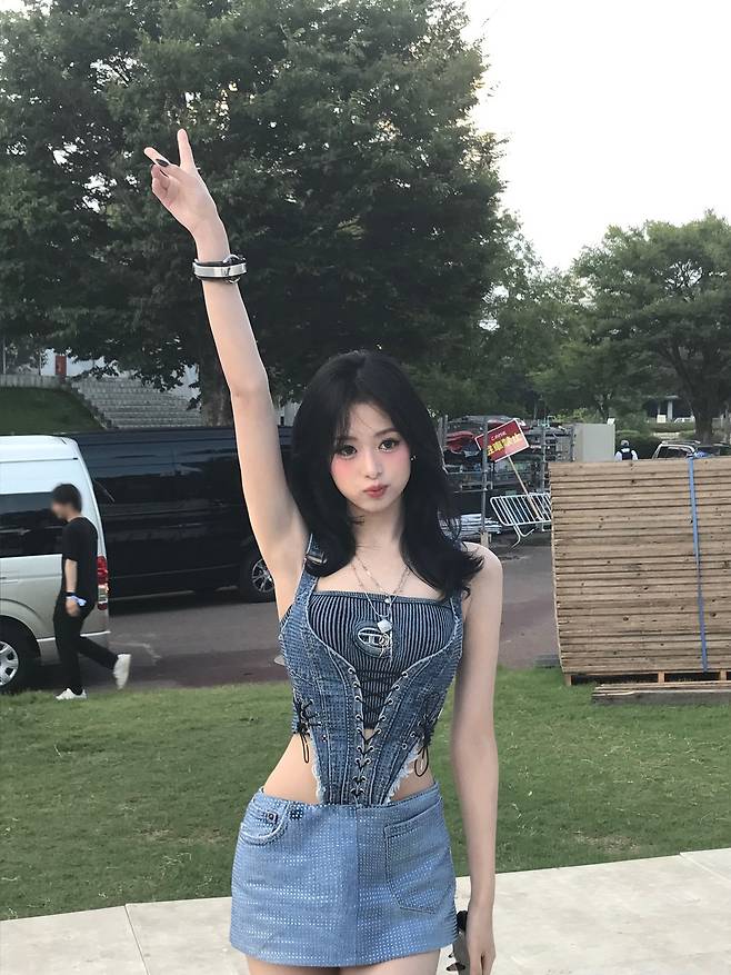 착장의 핵심은 레이스업 디테일이 돋보이는 데님 톱이다. 슬림한 실루엣이 직각어깨와 클레비지 라인을 자연스럽게 강조하며, 양옆의 스트링 장식이 허리를 더욱 잘록하게 잡아준다. 하의는 허벅지 라인을 드러내는 미니 데님 스커트로, 간결하면서도 힙한 무드를 배가시켰다. 여기에 실버 체인 네크리스와 굵직한 뱅글이 더해져 페스티벌 감성이 물씬 풍겼다. 팬들은 댓글에서 “청량하면서도 강렬하다”, “무대 밖에서도 완벽한 아티스트”라는 반응을 남겼다.