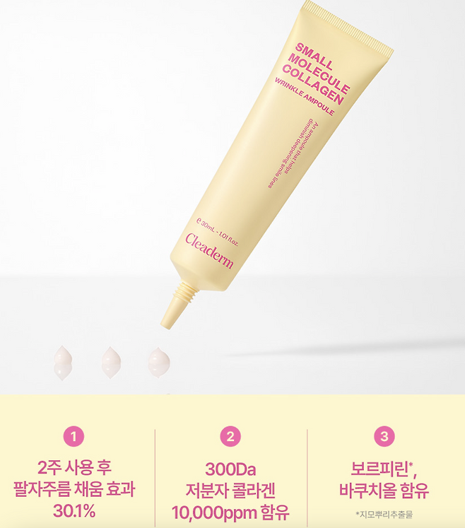 주요 성분은 저분자 콜라겐, 펩타이드로 주름 개선, 피부 탄력 강화가 특징인 제품입니다.