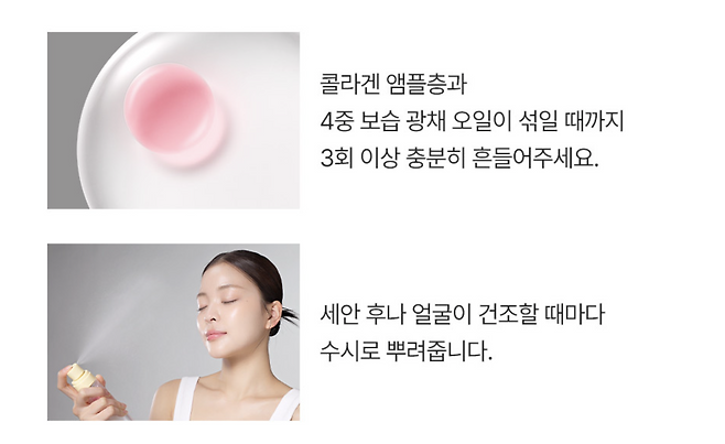 미스트 타입이라 언제 어디서든 수분과 영양 충전 가능 하면서 콜라겐+히알루론산이 피부를 촉촉하고 탄력 있게 유지시킵니다.