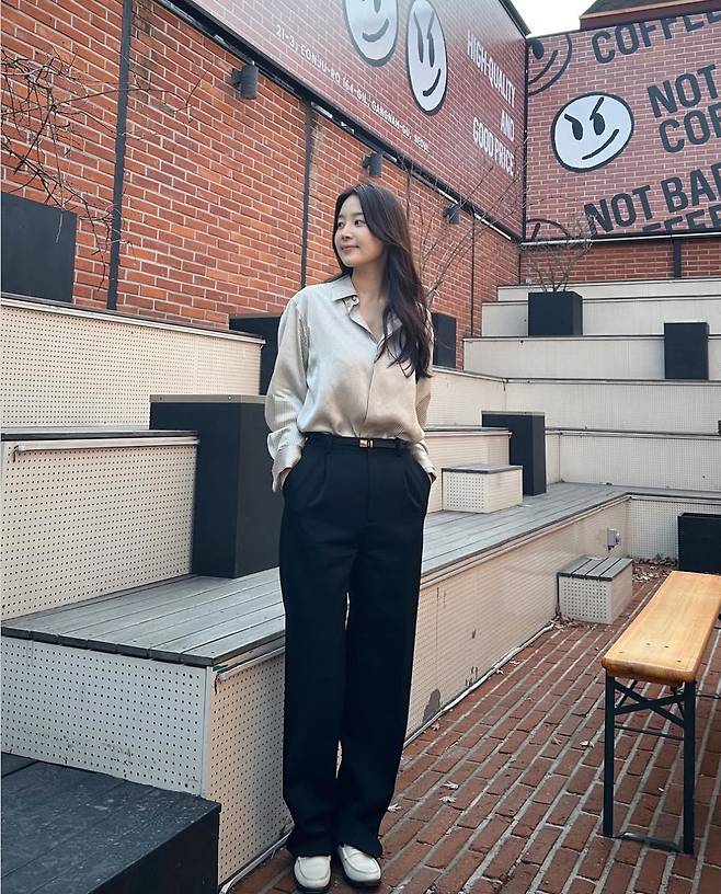 캐주얼한 배경과 대비되는 절제된 포멀룩으로 스타일 지수를 한껏 끌어올린 한지혜는 이번 룩을 통해 다시 한번 클래식의 정석을 증명했습니다.