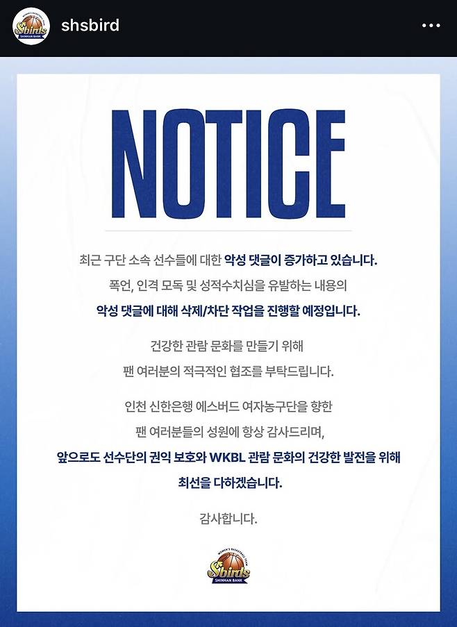 이에 따라 구단이 직접 대응에 나서는 사례도 종종 등장한다. 인천 신한은행은 30일 공식 소셜미디어에 “최근 구단 소속 선수들에 대한 악성 댓글이 증가하고 있습니다. 건강한 관람 문화를 위해 팬 여러분의 협조를 부탁드립니다”라는 안내문을 게시했다.