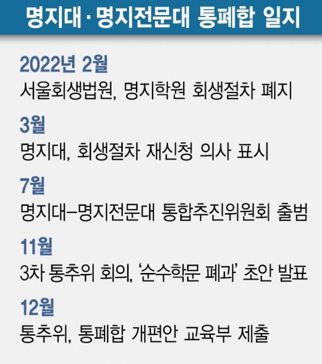 명지전문대와 통폐합을 추진하고 있는 명지대가 철학과·물리학과·수학과를 폐지할 방침인 것으로 확인됐다. 명지대·명지전문대 통합추진위원회와 통폐합 컨설팅을 맡고 있는 삼일회계법인이 관련 절차를 지난해 말로 못 박으면서 ‘졸속 행정’이라는 비판과 잡음이 끊이지 않고 있다.
