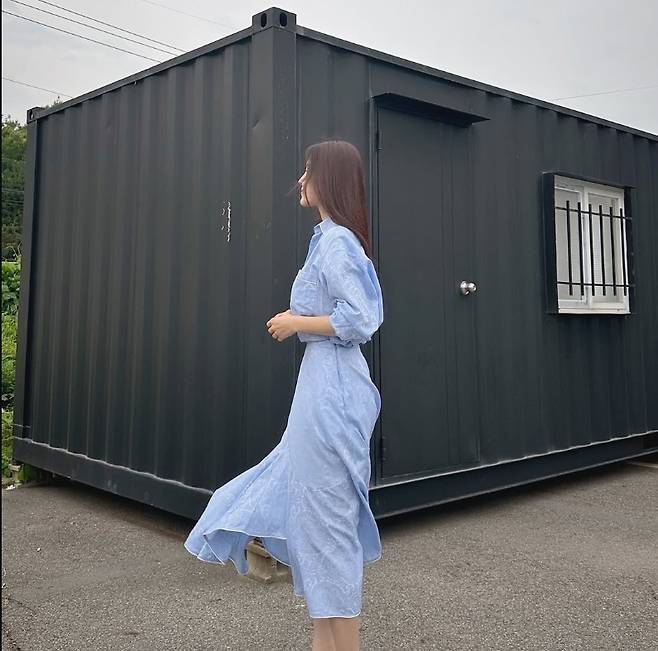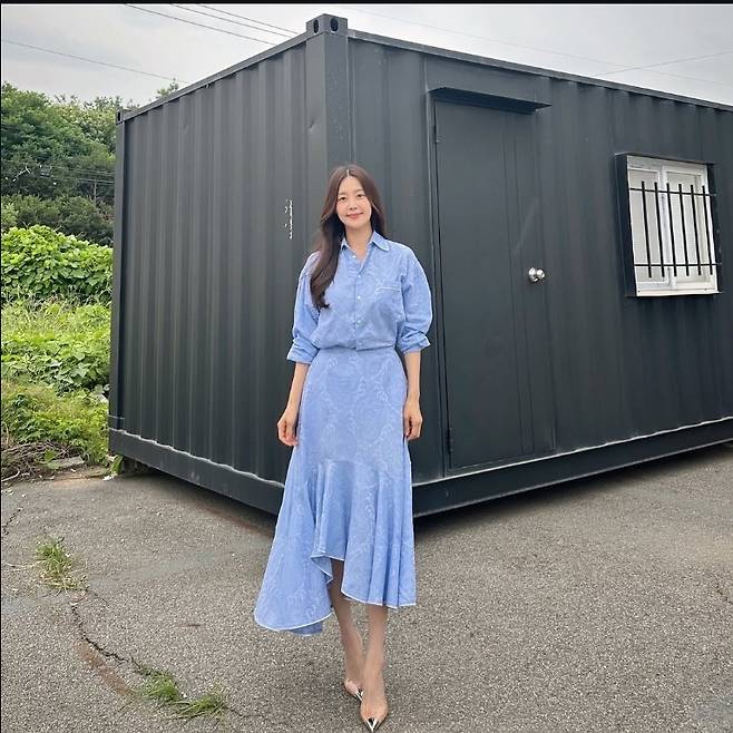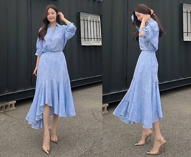 한지혜는 연한 블루 톤의 셔츠형 원피스를 입고 내추럴하면서도 고급스러운 스타일을 선보였습니다.