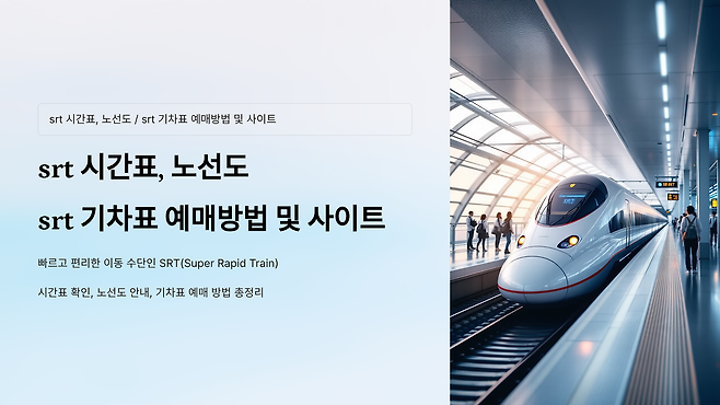 빠르고 편리한 이동 수단인 SRT(Super Rapid Train)! 장거리 여행이나 출장을 계획할 때 많은 분들이 이용하시는데요. 하지만 SRT 시간표를 어디서 확인해야 하는지, 노선도는 어떻게 봐야 하는지, 기차표는 어떻게 예매해야 하는지 헷갈리는 경우가 종종 있습니다. 이 글에서는 SRT 이용에 필요한 모든 정보를 한 번에 확인하실 수 있도록 SRT 시간표 다운로드 방법, 노선도 안내, 그리고 쉽고 빠른 기차표 예매 방법과 공식 예매 사이트까지 상세하게 정리해 드리겠습니다. SRT를 더욱 편리하게 이용하고 싶다면, 지금부터 주목해주세요!