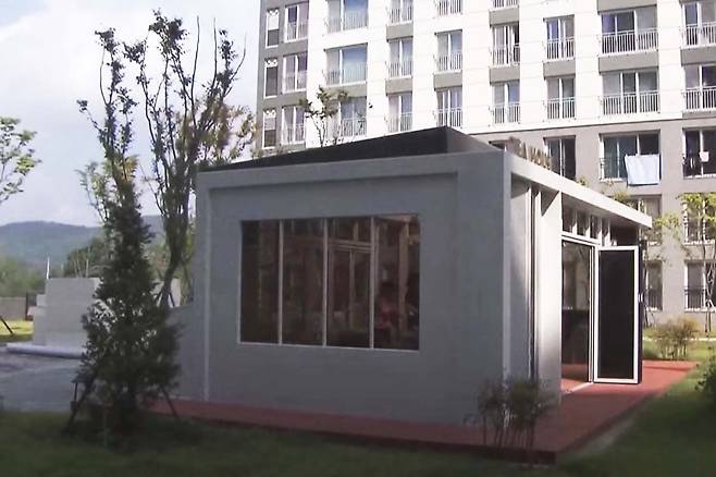 해당 아파트 단지 사이 컨테이너 크기의 작은 건물, 바로 ‘티 하우스’다. 해당 공간은 입주민이 차를 마시며 휴식을 취할 수 있도록 설치한 공간이지만, 조합원 측에 따르면 정작 내부에는 테이블과 의자 몇 개가 전부인 수준이다.