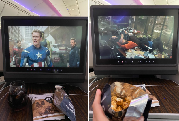 이코노미 좌석에는 USB 포트와 콘센트 둘 다 있었다. 콘센트도 USB 포트와 마찬가지로 화면 밑에 있어서 여러 가지 기기를 한 번에 충전하기 편했다. 긴 비행시간 가장 중요한 것은 바로 엔터테인먼트. 열심히 뒤적거려 찾아낸 한국영화는 모두 9편이었다. 이밖에 한국어로 더빙한 영화와 애니메이션 등 다양한 볼거리가 있었다.