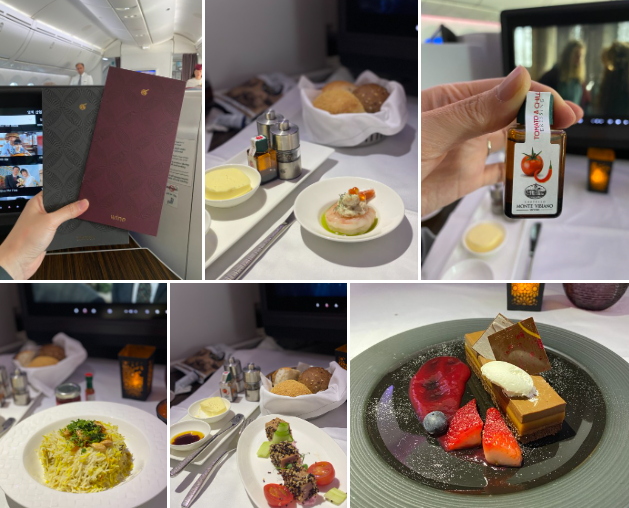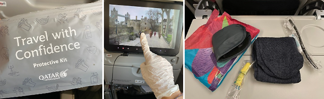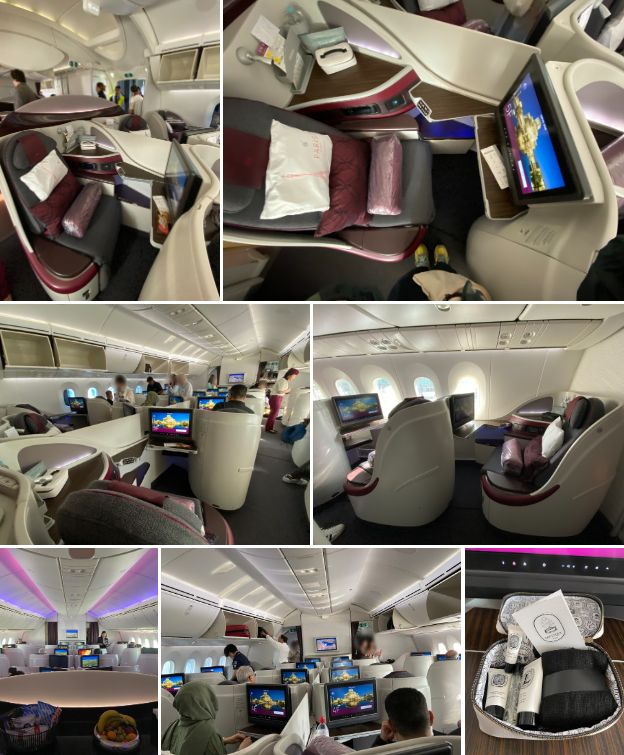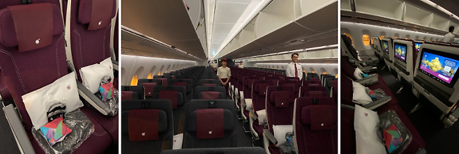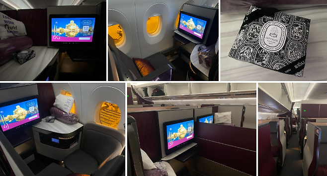 에어버스 A350-1000은 최첨단 기종이다. 전 세계 항공사 중 가장 넓은 이코노미 좌석을 제공한다. ‘퍼스트 같은 비즈니스’를 모토로 새롭게 선보인 Q스위트도 볼 수 있었다. 좌석이 마치 모듈처럼 되어 있어 일행끼리 공간을 공유해서 사용할 수 있다. 비즈니스 애머니티는 딥티크 제품을 사용한다. 잠잘 때가 되면 승무원이 와서 잠자리를 꾸며 주고 잠옷과 슬리퍼도 제공한다.