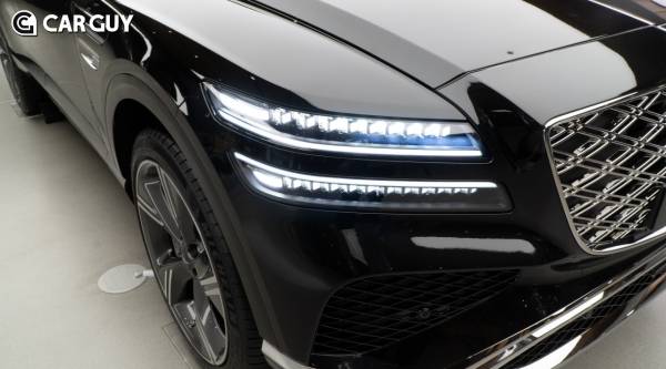 제네시스의 상징인 두 줄 헤드램프는 MLA(Micro Lens Array) 기술을 탑재한 램프로 재탄생해 첨단 기술과 디자인의 완벽한 하모니를 보여준다. 아울러 넓은 형상의 스키드 플레이트를 적용한 전면 범퍼는 단단하고 강인한 스포츠 SUV 이미지를 구현한다. 기요셰(Guilloché) 패턴이 각인된 신규 엠블럼은 고급스러움을 강조한다.