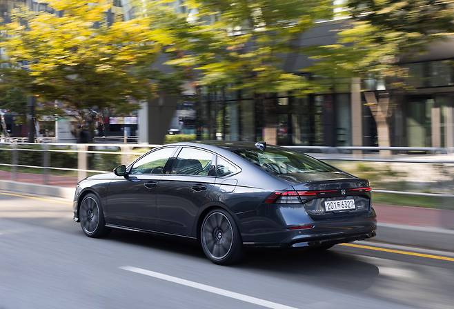 대신 차체 길이는 4,970㎜로, 65㎜ 더 늘려 이제 5m를 코앞에 뒀다. 뒤 트레드도 하이브리드 기준, 15㎜ 더 넓혔다. 혼다코리아 상품 담당자는 “어코드가 동급에서 가장 낮고 넓으며, 준대형 세단의 품격과 멋진 디자인으로 어필한다”고 소개했다. 그러나 최근 토요타 캠리나 현대 쏘나타, 기아 K5 디자인의 도전과 파격에 비해 겸손과 절제가 두드러진다.