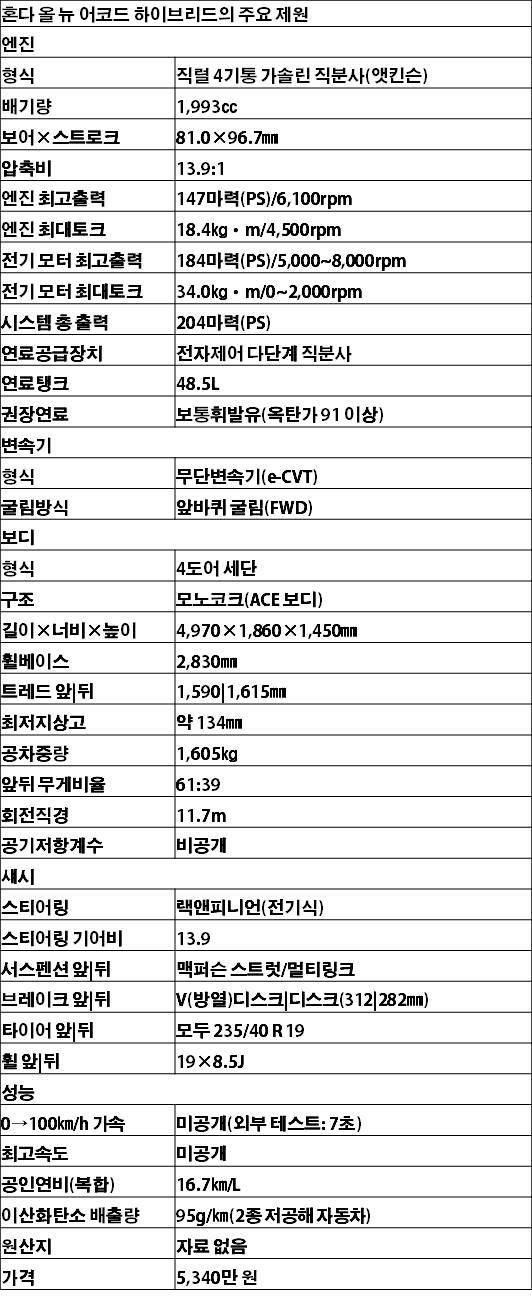 신형 어코드 하이브리드는 4세대 2모터 하이브리드 시스템을 얹는다. 엔진은 직렬 4기통 2.0L 가솔린 직분사 i-VTEC이다. 연료는 고압 다단계 분사로 최대한 효율적으로 뿌린다. 또한, 압축행정 때 흡기 밸브를 늦게 닫아 피스톤이 솟아오를 때 저항을 줄인 ‘앳킨슨 사이클(정확히는 밀러 사이클)’로 40%의 열효율을 달성했다. 여기까진 경쟁사와 비슷하다.