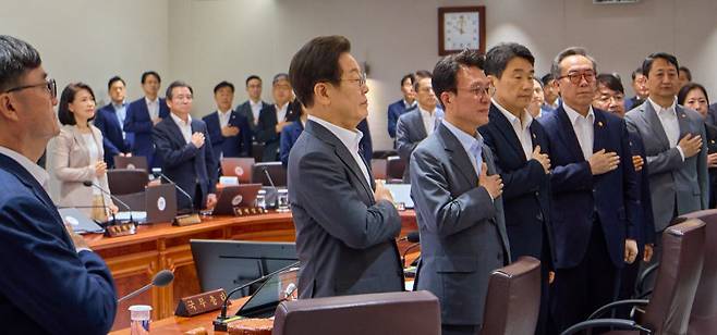 | 이진숙 방통위원장 참석한 국무회의 이재명 대통령이 8일 서울 용산 대통령실 청사에서 국무회의를 주재하기에 앞서 국민의례를 하고 있다. 이 대통령은 국무회의에서 “국정을 논하는 자리이기에 비공개 회의 내용을 개인 정치에 왜곡해 활용해선 안 된다”고 질책했다. 이를 두고 윤석열 정부에서 임명된 이진숙 방송통신위원장(뒷줄 왼쪽)을 겨냥한 발언이란 해석이 나왔다. 대통령실 제공 |
