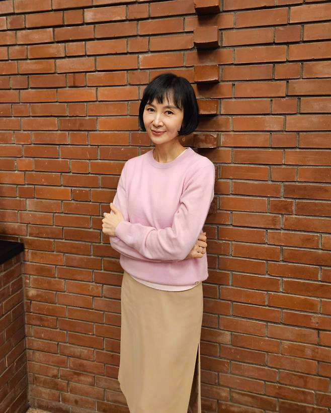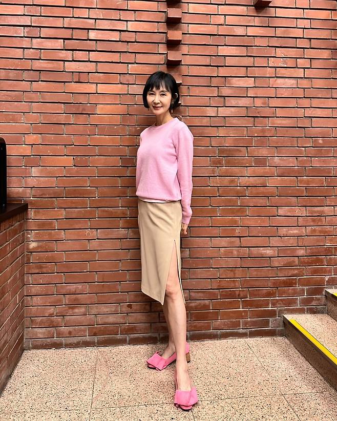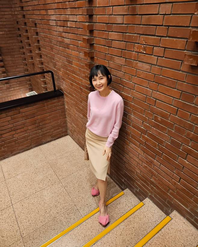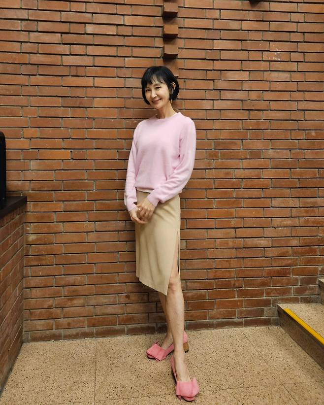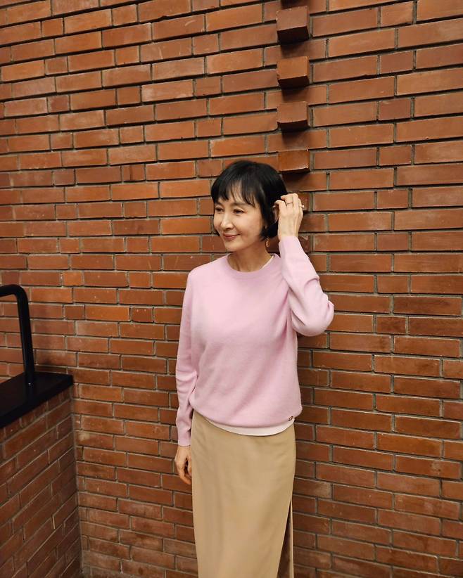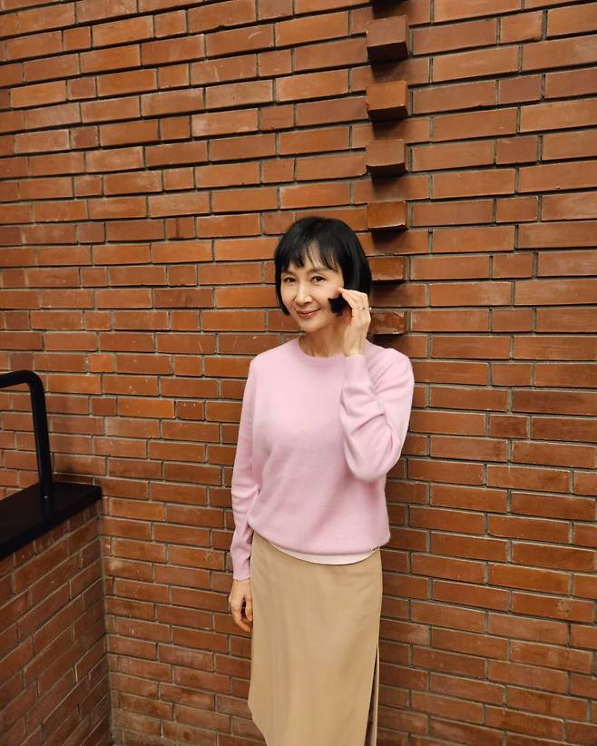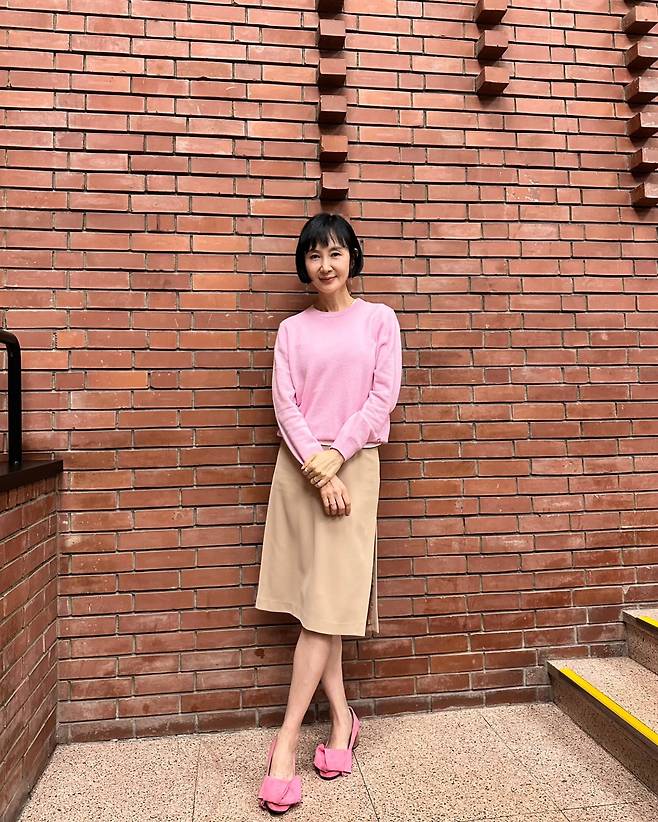 사진 속 채시라는 단발 헤어스타일에 분홍색 니트와 베이지 미디스커트를 매치했습니다.