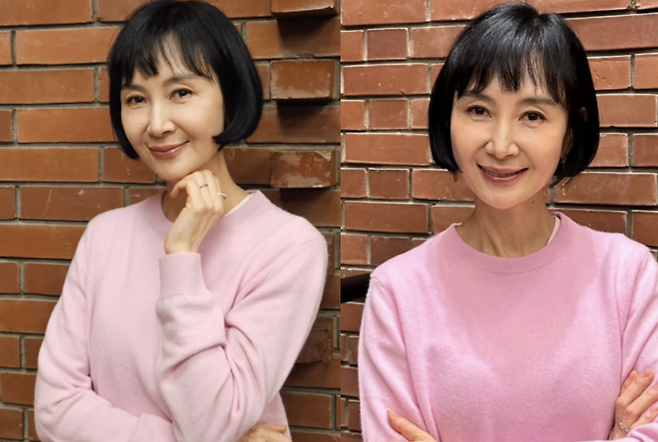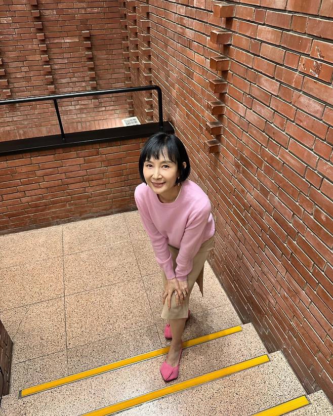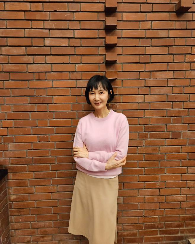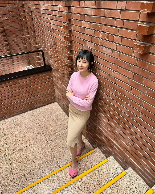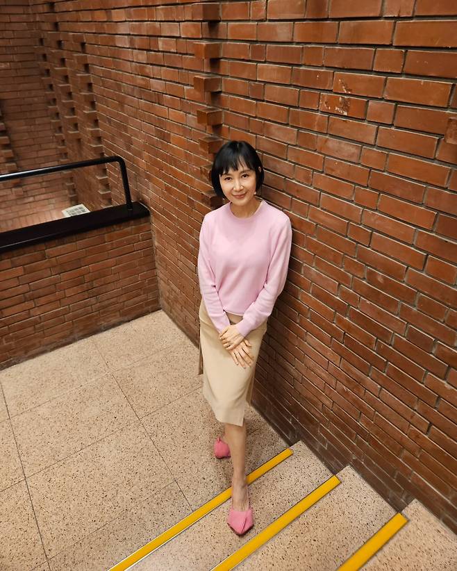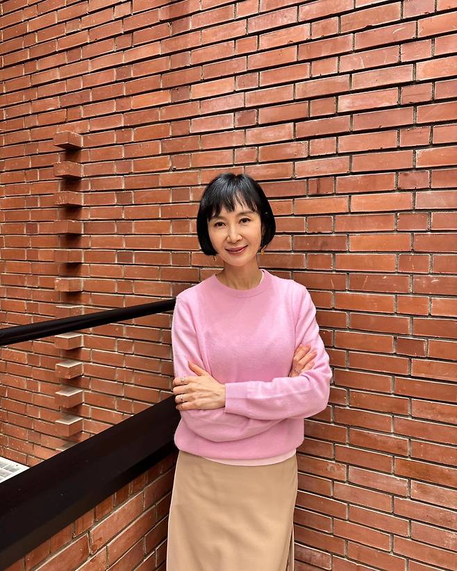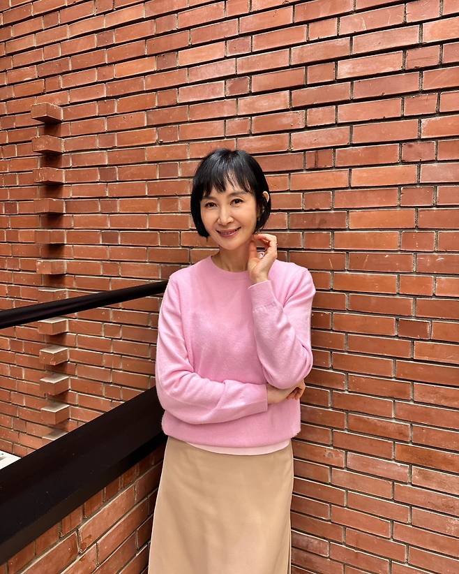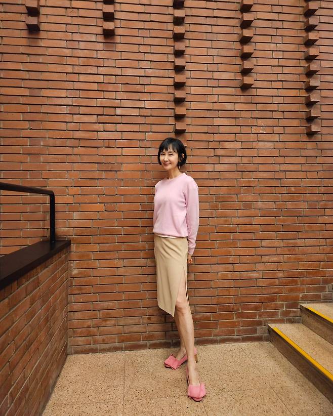 사진 속 채시라는 단발 헤어스타일에 분홍색 니트와 베이지 미디스커트를 매치했습니다.