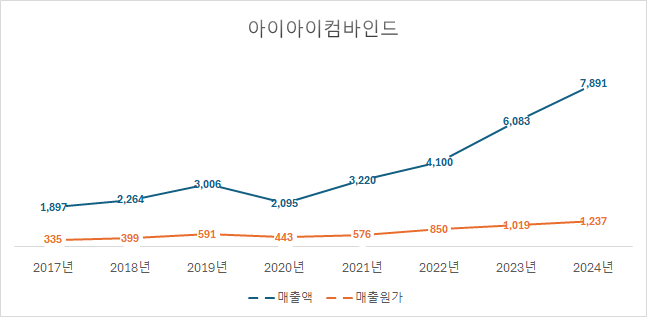아이아이컴바인드는 2017년부터 2020년을 제외하고 2024년까지 꾸준한 매출 성장을 보인다. 매출액은 2017년 1897억 원에서 2024년 7891억 원으로 4배 이상 증가했다. 특히 2024년에는 전년 대비 1800억 원 이상의 가파른 매출 증가를 기록한다.