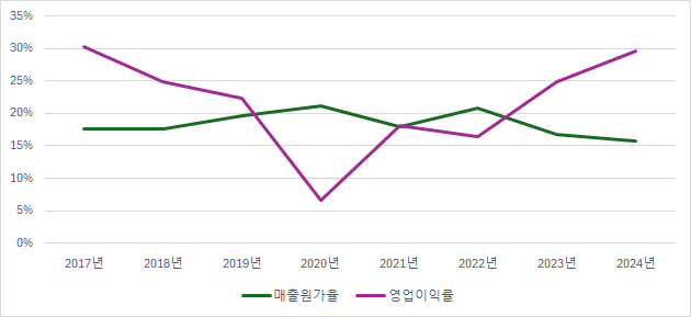 영업이익 역시 2017년 335억 원에서 2024년 2338억 원으로 약 7배 이상 성장하며, 영업이익률도 꾸준히 상승하는 추세다. 이는 매출의 성장과 더불어 수익성이 함께 개선된다는 점을 보여주는데 즉 ‘많이 팔면 팔수록 더 벌 수 있는 구조’를 뜻한다.